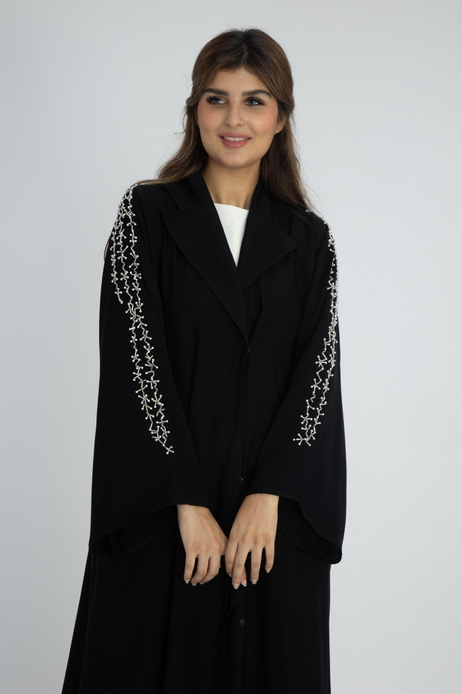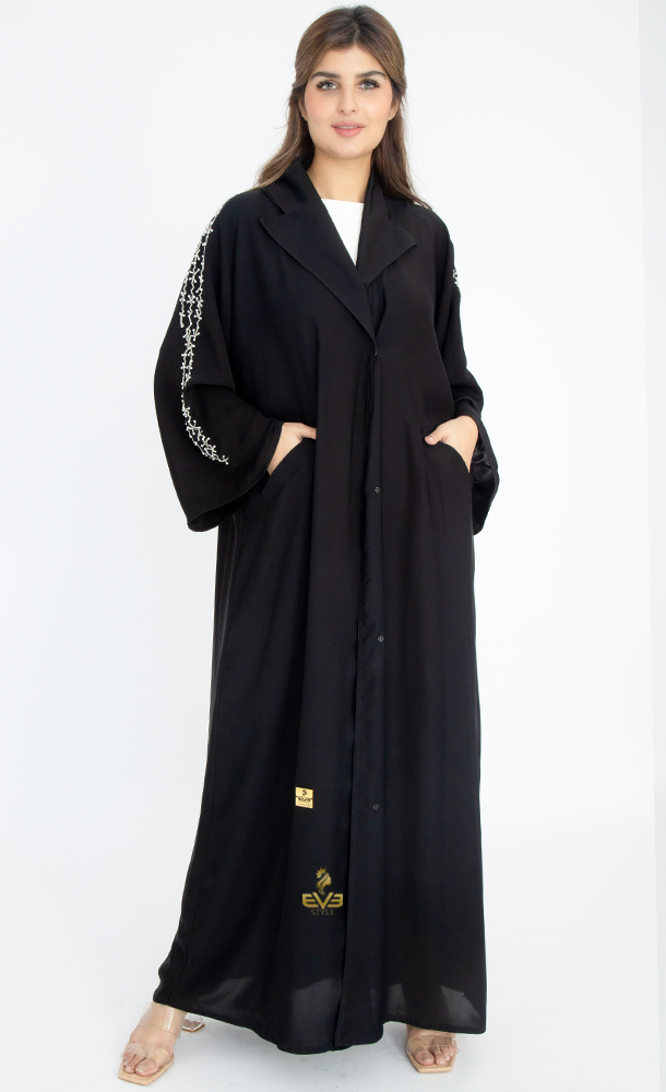 عباية كتف تطريز فضي إيف ستايل هي قطعة فريدة من نوعها تتميز بتفاصيلها الجميلة والمبهجة وتصميمها يتضمن تطريزًا فضيًا راقيًا على الأكمام مما يضفي لمسة من الأناقة والفخامة على العباية حيث تستهدف النساء اللاتي يرغبن في أناقة محتشمة ومريحة في آن واحد.