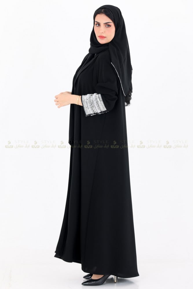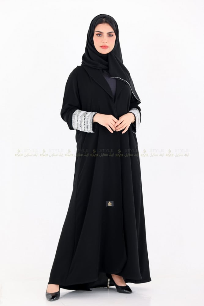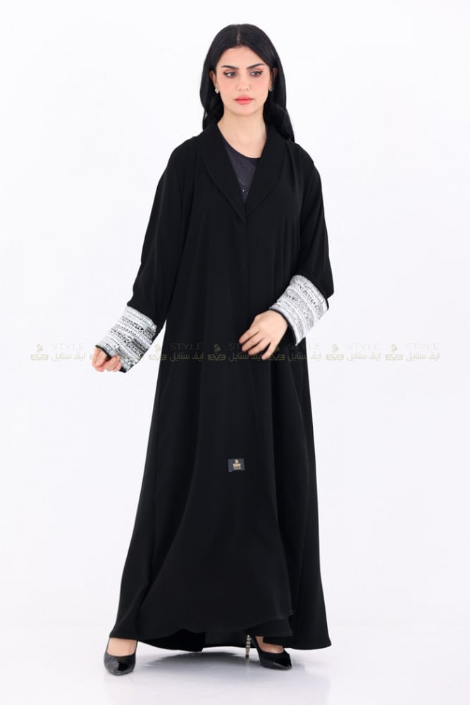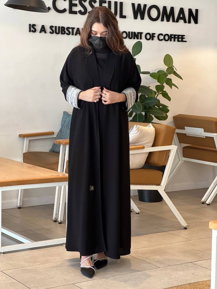 - الكم المطرز بالتطريز الفضي الفاخر يعزز جمالية العباية.