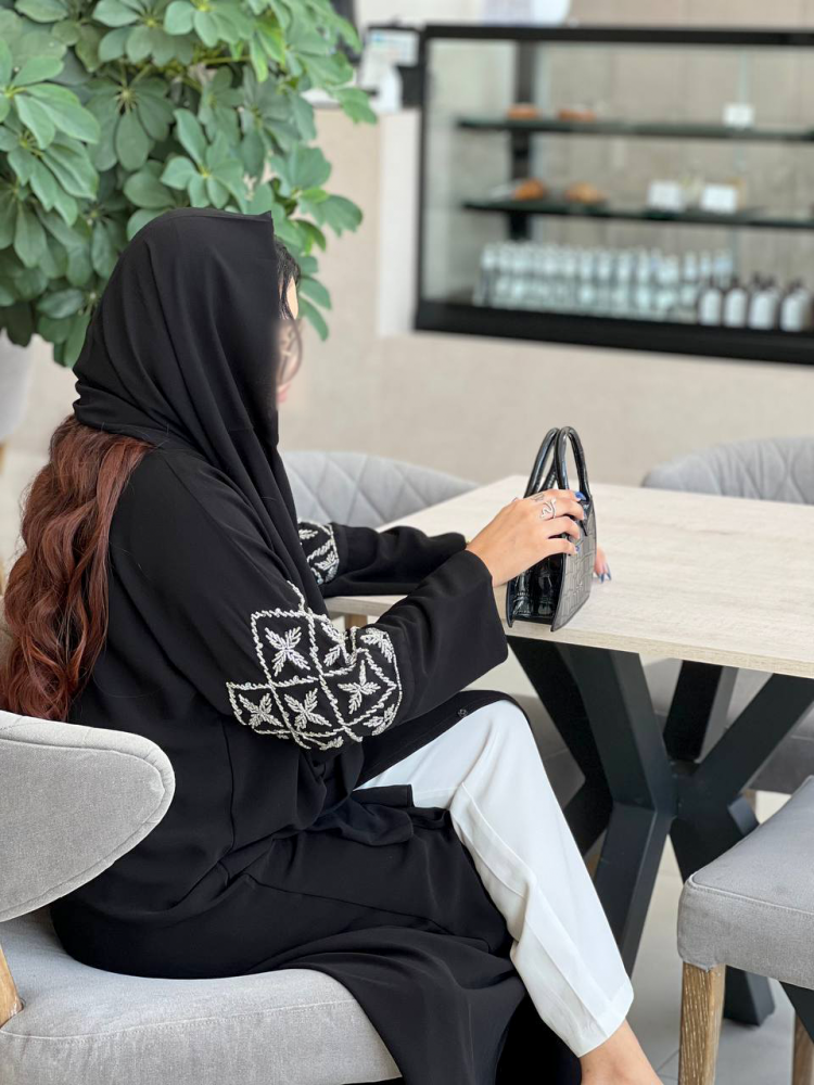 - يتميز الكم بتطريز فضي فاخر ما يضفي لمسة راقية ومتألقة ويجعلها قطعة فنية فريدة.
