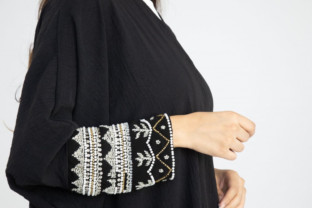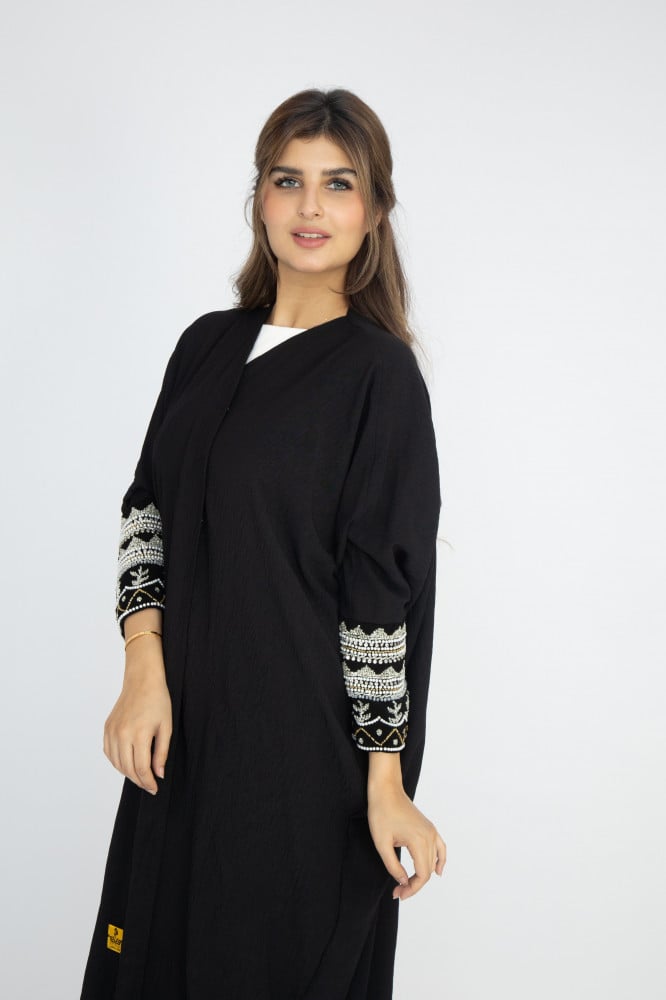 - اللون الأسود الأنيق يأتي اللون الأسود بتصميمه الكلاسيكي والأنيق، ويعد خيارًا مثاليًا للعباية الملكية، حيث يعزز أناقتها ويضفي لمسة من السحر والأناقة.